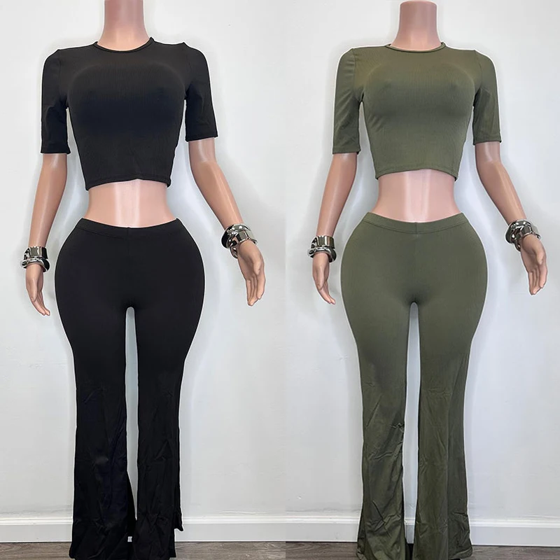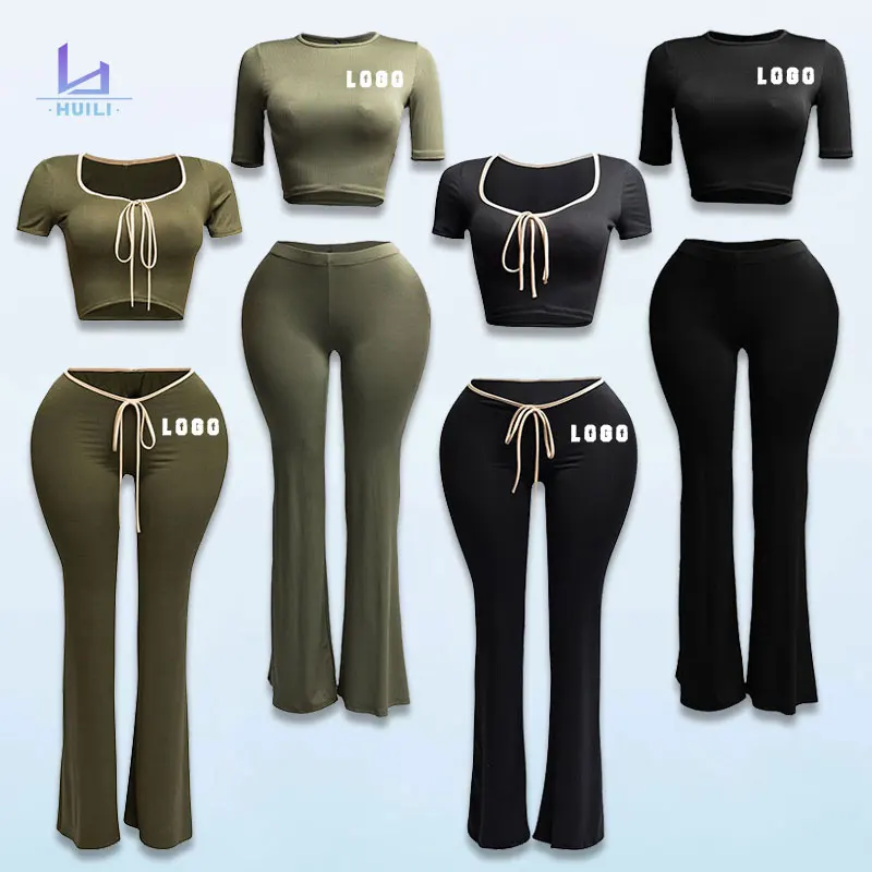 Huili Manufacturer Oem Premium Knitted O Neck Short Sleeve Crop Top Flare Legging Pajamas Cotton Women's Summer Loungewear Sets